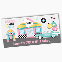 Featuring a retro diner background adorned with classic black & white check print and a delightful pastel palette of pink, turquoise, yellow, and grey, our design captures the essence of the era. The set showcases charming clipart by Twingenuity Graphics, including a chevrolet, jukebox, poodle jackets, fancy sunglasses, a vinyl record, and the timeless phrase, "Shake, Rattle and Roll." What's more, you can customise the decorations with your own text, adding a personal touch that's uniquely yours. Want to see how it looks before you order? No problem! Our online editor lets you preview your party decorations, ensuring everything is just the way you want it.