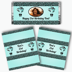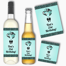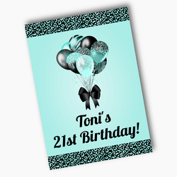 The decorations boast a bold Tiffany Aqua Blue background elegantly complemented by turquoise leopard print edges by DigitalCurio, enhancing the party mood. Contrasting black cursive fonts are used to personalise the items with the celebrant's name and age, adding a personal touch to your party decor.