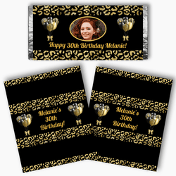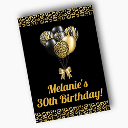 Our Black & Gold Balloons theme showcases a captivating array of celebratory balloons, artistically drawn by DigitalCurio. Immerse your guests in a luxurious atmosphere with the solid black background, intricately adorned with black and gold leopard print edges. The contrasting gold foil cursive fonts add an extra level of sophistication, personalising the decor with the celebrant's name and age.