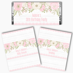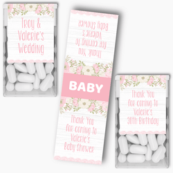 Featuring a stunning design with a rustic boho light white wooden timber background, beautiful hand-painted pastel pink and cream peony flowers, and greenery clipart by designloverstudio, these decorations are sure to impress. The design is completed with contrasting pink cursive fonts and beautiful pink lace edges, making it a truly unique and personalised addition to your celebrations.