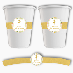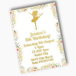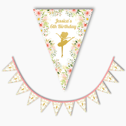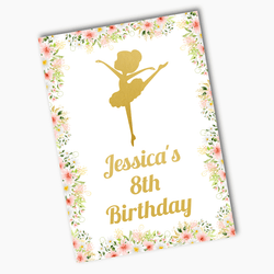 Introducing our Personalised Floral Ballerina Birthday Party Decorations, perfect for any little girl's ballet themed celebration. Our stunning design features a gold foil silhouette ballerina clipart by SusanCraftDesigns on a white background adorned with hand-painted watercolour pink and white flowers by heyiamalice, finished with contrasting gold foil cursive font.