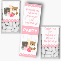 Are you searching for the perfect decorations for your little girl's christening or baptism celebration? Look no further than our personalised girls teddy bear christening & baptism decorations! Our gorgeous design features an adorable teddy bear, bible, and candle clipart by pixelpaperprints on a rustic white timber background, complemented by contrasting pink cursive fonts.
