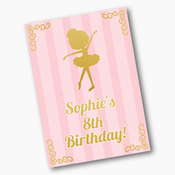 Our Ballerina Party Decorations are customised with your child's name and age, adding a personal touch to this magical occasion. The design's beauty is amplified by a 2-tone pastel pink stripe background, further highlighted by gold foil cursive fonts. This delicate aesthetic is sure to captivate your guests and make your child's special day unforgettable.