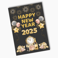 The Design Features a Bold and Beautiful Charcoal Background with Rose Pink and Gold Foil Accents. Festive Clipart Images drawn by NinaNinaCraft feature an Intricate Clock, Balloons, Champagne, and Celebratory Fireworks.