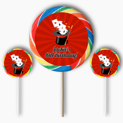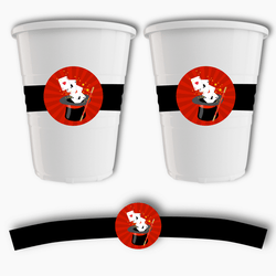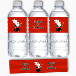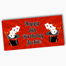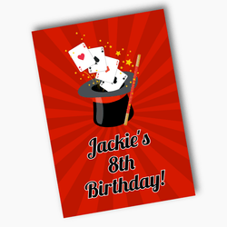 Add a magical touch to your child's birthday with our Personalised Magic Birthday Party Decorations. These exquisite Magic Party Decorations, boasting a captivating magic-themed clipart by AMBillustrations, are sure to enchant your little guests. The vibrant imagery of cards darting out of a magician's hat, accompanied by a mystical wand, is set against a striking red backdrop, with the details inscribed in bold black font.