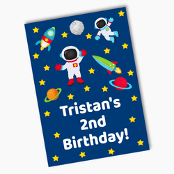 Are you ready to blast off into a fun and exciting party adventure? Look no further than our Personalised Outer Space Birthday Party Decorations! Perfect for any child's birthday celebration, these decorations feature fun and colourful clipart of the Sun, Moon, Astronauts, Planets and Stars by ScrapbookGems. The solid navy blue background and your choice of font colour make it a great unisex option for boys or girls parties.