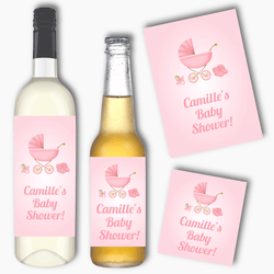 Sold out - Personalised Pastel Pink Vintage Pram Wine & Beer Labels