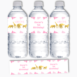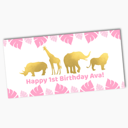 Our kit is brimming with beautifully designed decorations, all adorned with your child's name and age for that extra personal touch. The theme is a delightful blend of femininity and adventure, perfect for your little girl's special day. The decor features a lavish array of gold foil silhouette jungle animals, including a rhinoceros, an elephant, a giraffe, and a lion, all masterfully created by FunClipArtStudio. These majestic animals are complemented by delicate pink greenery leaves, adding a soft touch to the wild safari experience.