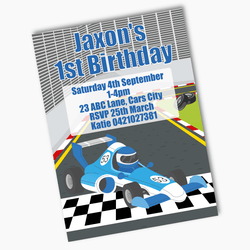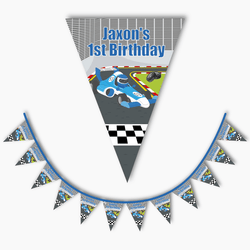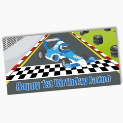 The design features a blue and white Formula 1 Grand Prix style racing car crossing the finishing line on a race track background, with your child's name and age in a complementary font color. Our Personalised Party range includes Banners, Bunting, Invites, Loot Bags, Drink Labels, Customised Stickers & Party Favours, so you can add a personal touch to every aspect of the party.