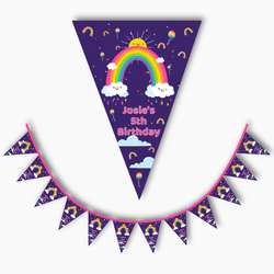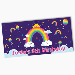 Our decorations feature a gorgeous purple background with rainbows, clouds, a sun, and rainbow balloons. Plus, you can personalise it with your child's name and age for an extra special touch. Choose from six bold font colours to make it truly unique.