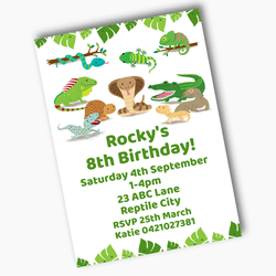 Our design features clipart by LittleLiaGraphic, showcasing a variety of reptiles including crocodiles, snakes, cobras, lizards, goannas, geckos, chameleons, and turtles. The greenery border and bold green font add to the fun and exciting atmosphere of the party.