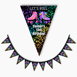 Choose from two stunning backgrounds: the edgy Black with Rainbow Splatter or the whimsical Pastel Rainbow with Sparkles. Both options feature trendy rainbow and stars design roller skates by in clipart, creating a vibrant and energetic atmosphere for your party. With the ability to add your own custom text, you can truly make these decorations your own. Plus, you can preview your personalised party decorations in our convenient online editor before making your final selection.