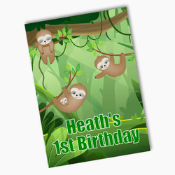 Featuring three of the cutest sloths drawn by JoKavanaghDesigns on a Jungle backdrop with your choice of complementing solid font colour, this fun design is sure to be a hit with your little one and their guests.