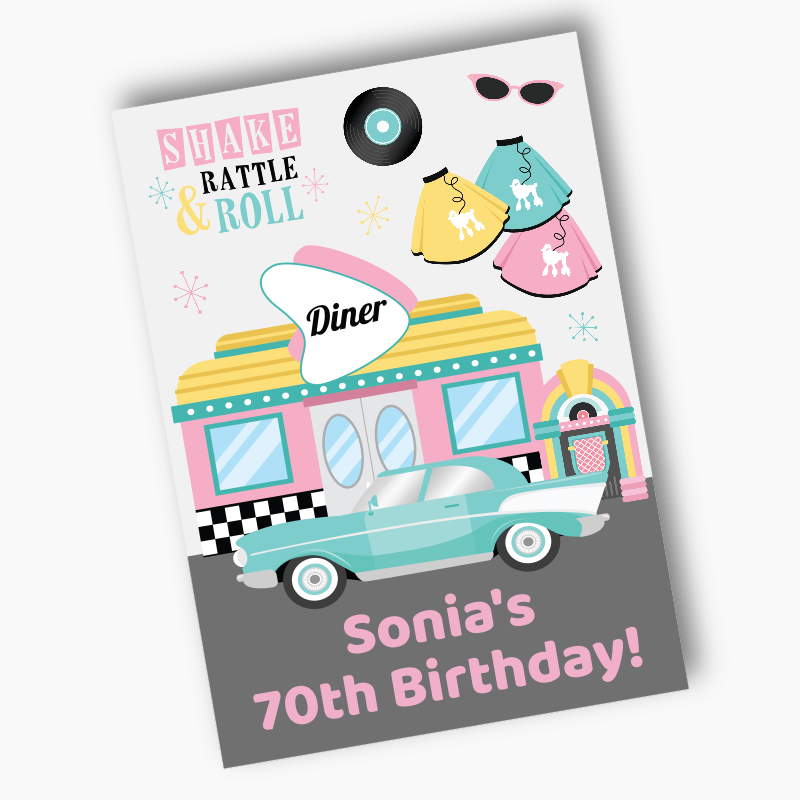 Featuring a retro diner background adorned with classic black & white check print and a delightful pastel palette of pink, turquoise, yellow, and grey, our design captures the essence of the era. The set showcases charming clipart by Twingenuity Graphics, including a chevrolet, jukebox, poodle jackets, fancy sunglasses, a vinyl record, and the timeless phrase, "Shake, Rattle and Roll." What's more, you can customise the decorations with your own text, adding a personal touch that's uniquely yours. Want to see how it looks before you order? No problem! Our online editor lets you preview your party decorations, ensuring everything is just the way you want it.