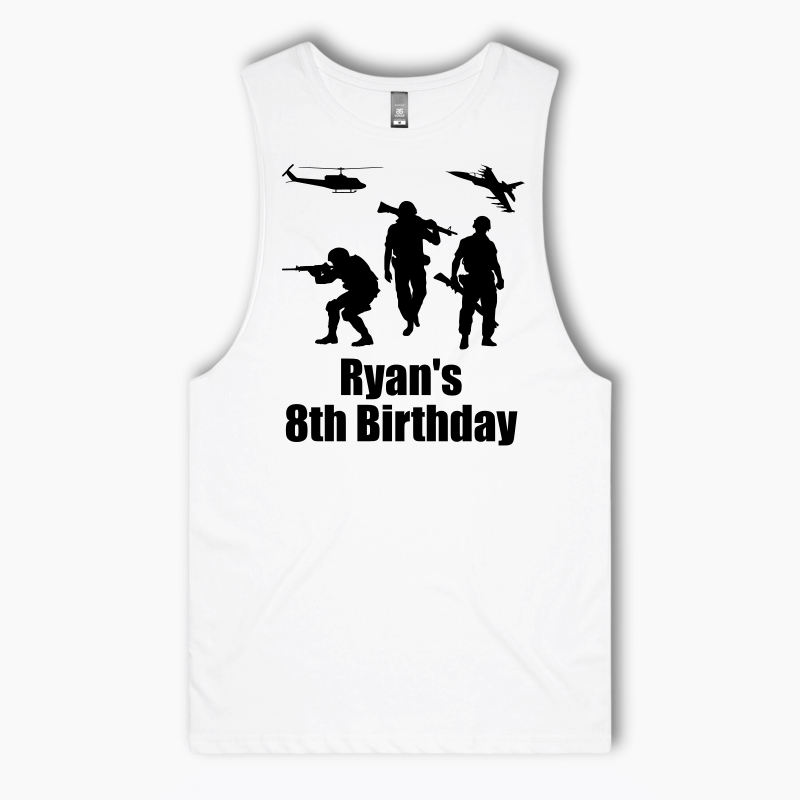 Elevate your celebration style with our Custom Army and Camouflage Party Men's Singlet Top, uniquely designed to add a personalised flair to your festivities. This men's singlet top is the ultimate selection for incorporating a bespoke touch that seamlessly matches your party theme, turning it into a key piece for any joyous occasion.