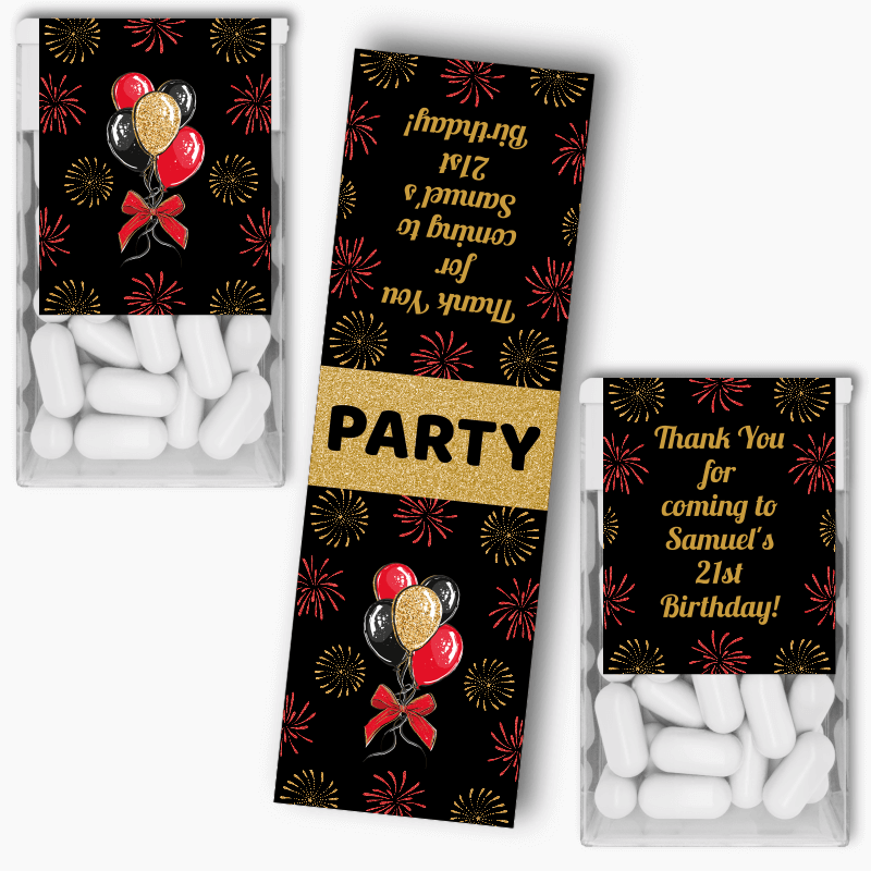 So why settle for boring Tic Tac containers when you can add your personal touch with our Personalised Black, Gold & Red Balloons Party Tic Tac Labels? Make your next celebration unforgettable with our fun and unique party favours. Order now and let the party begin!