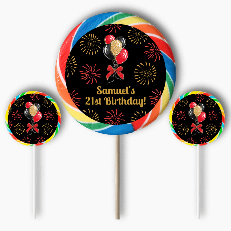 The design features a bold black background, accentuated with gold foil and vibrant red highlights. These decorations are brought to life by the beautiful clipart images of celebratory balloons and fireworks, meticulously crafted by CollartStudio. The theme is versatile, perfect for men's, women's, or gender-neutral parties, and suitable for all ages.