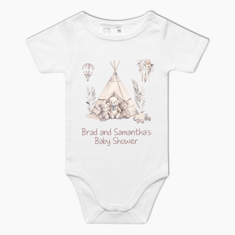 Celebrate your baby's special day with an outfit as unique as the occasion itself. Order your Personalised Boho Teddy Bears Baby Shower One-Piece Romper today and make your little one the star of the party.