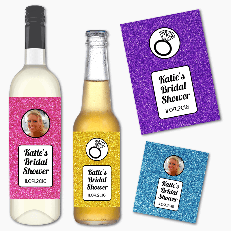 Take your bridal shower celebration to the next level with our Personalised Glitter Print Wine & Beer Bottle Labels. These labels, which are customisable with the bride-to-be's name and the date of the bridal shower, are available in eight dazzling glitter print colours.