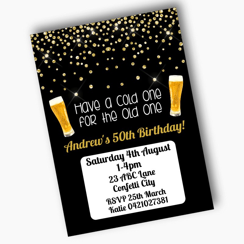 The design is eye-catching, featuring a bold black background punctuated by a spray of gold glitter confetti and whimsical beer glasses, each element meticulously drawn by StrawberriqueStudio. This fun theme is an excellent choice for men's milestone parties, be it the big 4-0, 50th, 60th, 70th, or even 80th birthday celebrations.