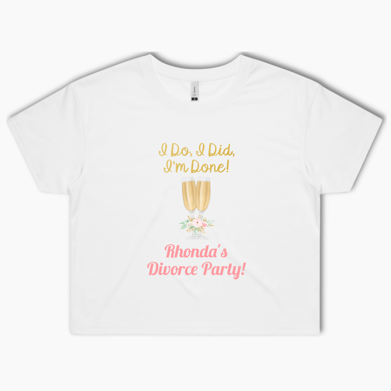 Transform your celebration wardrobe with our Custom Floral Divorce Party Crop Shirt, designed to add a splash of personalised style to your festivities. This chic women's crop top is the perfect choice for bringing a unique touch to your party theme, making it an indispensable item for any joyous event.