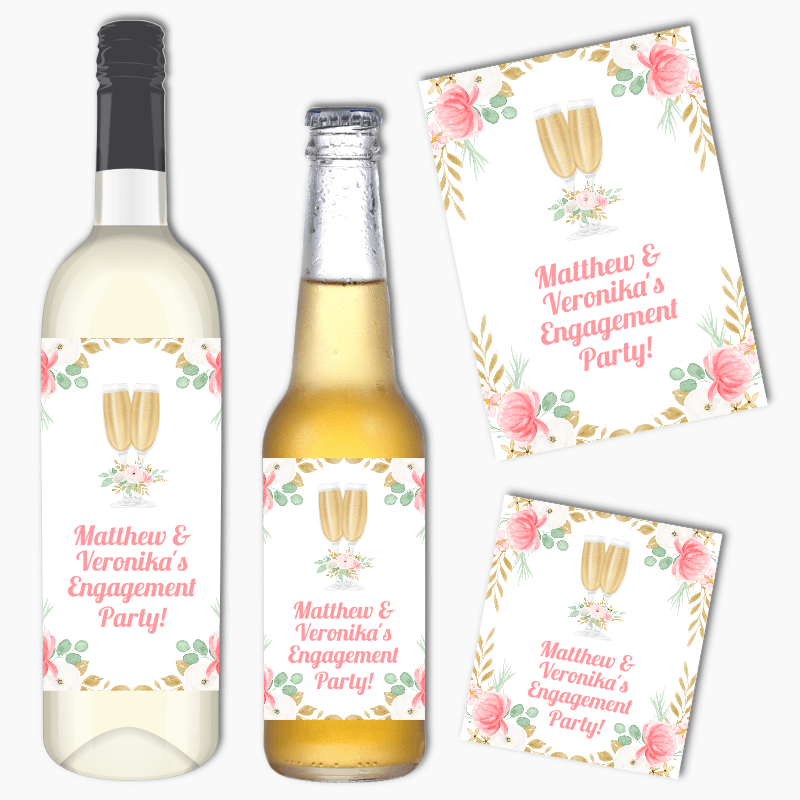 from $11.54Personalised Pink & Gold Floral Engagement Party Wine & Beer Labels