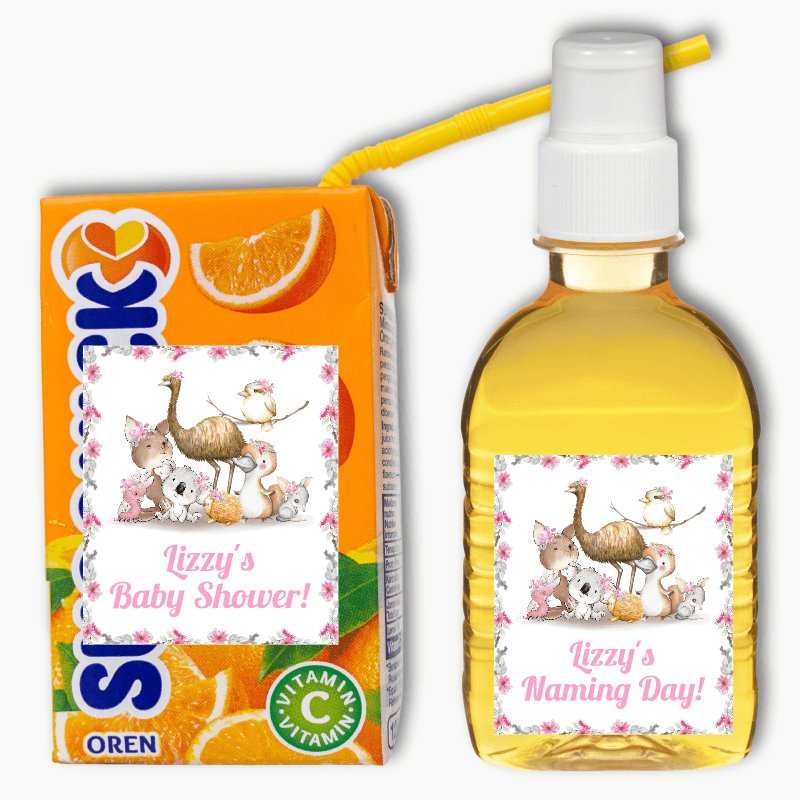 Introducing our Personalised Floral Australian Animals Baby Shower Decorations, the perfect addition to your girls' baby shower or baby welcome celebrations. This beautiful watercolour design features Australian pink florals and eucalyptus leaves on a white background, along with hand-painted Aussie animals including a kangaroo, koala, emu, kookaburra, platypus, bilby, galah, and echidna created by Monique Digital Art.