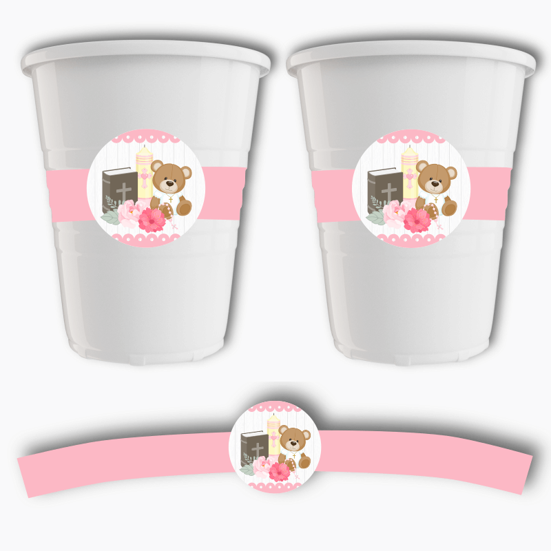 Are you searching for the perfect decorations for your little girl's christening or baptism celebration? Look no further than our personalised girls teddy bear christening & baptism decorations! Our gorgeous design features an adorable teddy bear, bible, and candle clipart by pixelpaperprints on a rustic white timber background, complemented by contrasting pink cursive fonts.