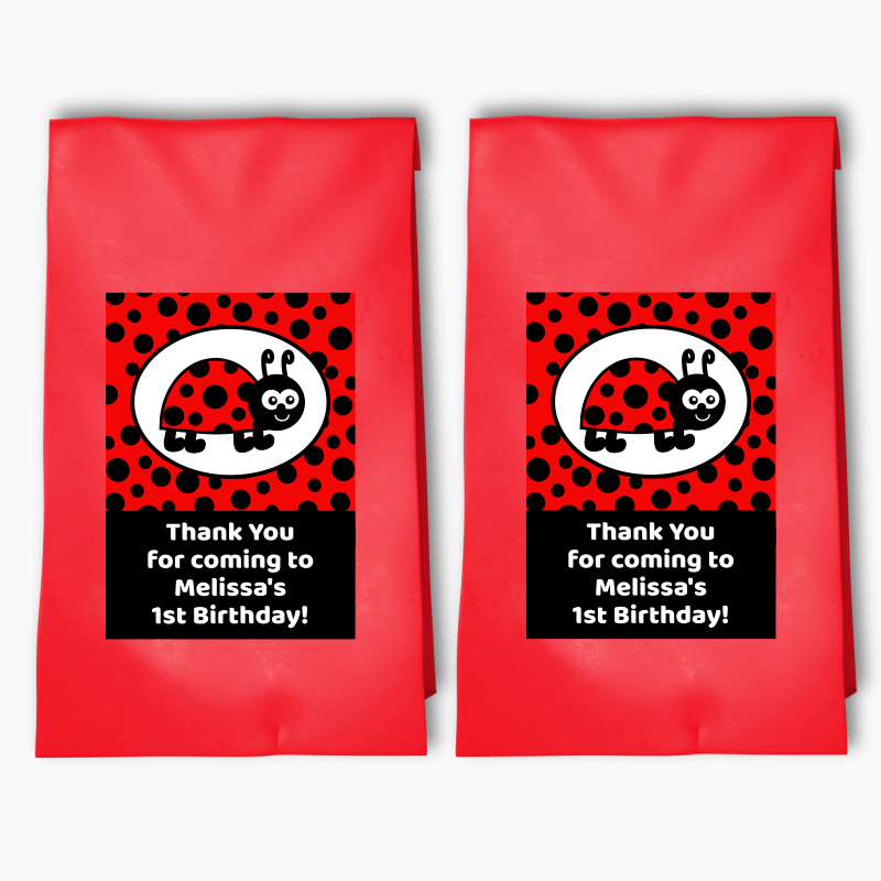 Are you looking for a way to make your party unforgettable? Look no further than our Personalised Lady Bug Party Bags & Labels! Our Loot Bags are the perfect way to thank your guests for coming and to send them home with a little something extra.