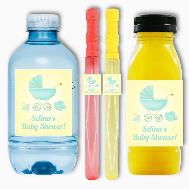 Looking for a fun and versatile way to add a personal touch to your party decorations? Look no further than our Personalised Pastel Mint & Lemon Vintage Pram Baby Shower Rectangle Stickers! These customised stickers are perfect for decorating drinks, favours, loot boxes, and even bubble wands!