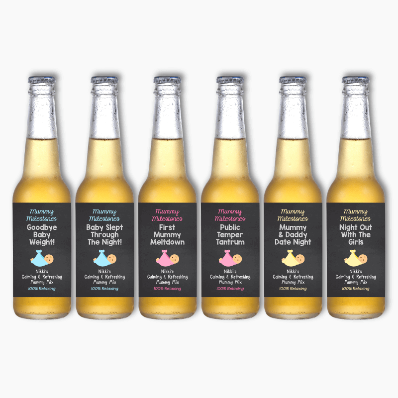 Celebrate the journey of motherhood with our Personalised 'Mummy Milestones' Beer Labels, the perfect gifts for a new mum. This unique baby shower gift is not only thoughtful but also humorous and relatable. Each pack contains six specially designed labels in three vibrant colour options, customised with the recipient's name for that extra personal touch.