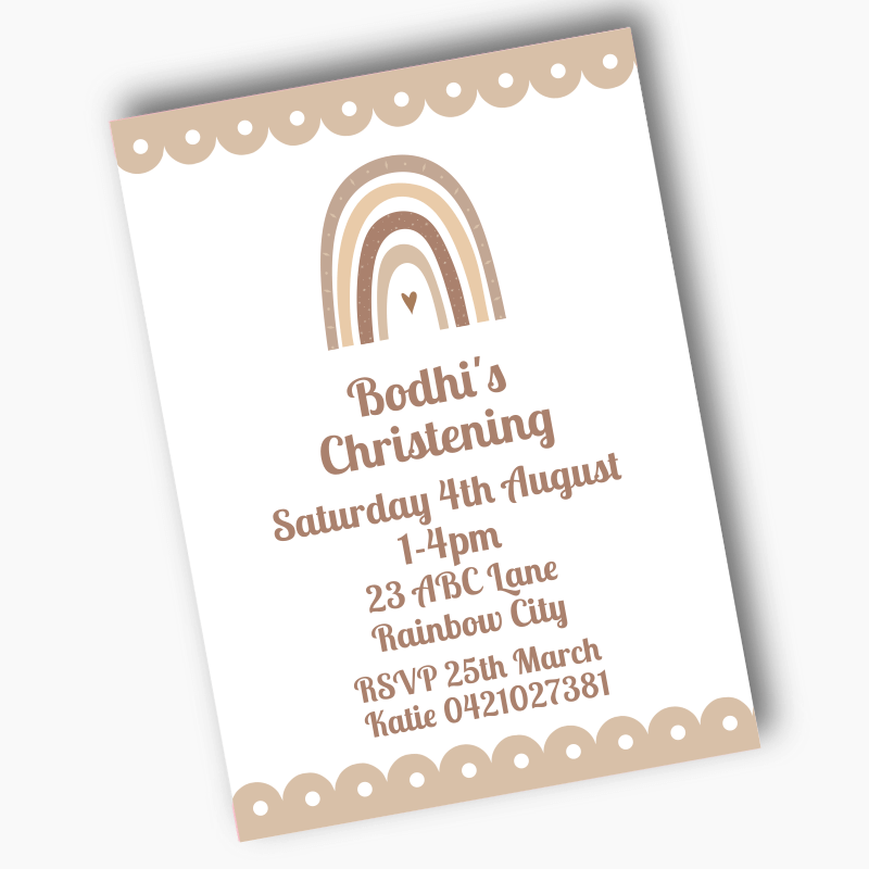 The captivating design showcases hand-painted watercolour boho rainbows in beautiful brown earth tones, created by the talented artists at ABdigitaldesign. Set against a pristine white background, the brown cursive fonts and delicate scallop borders lend an air of sophistication and romance to your wedding decor.