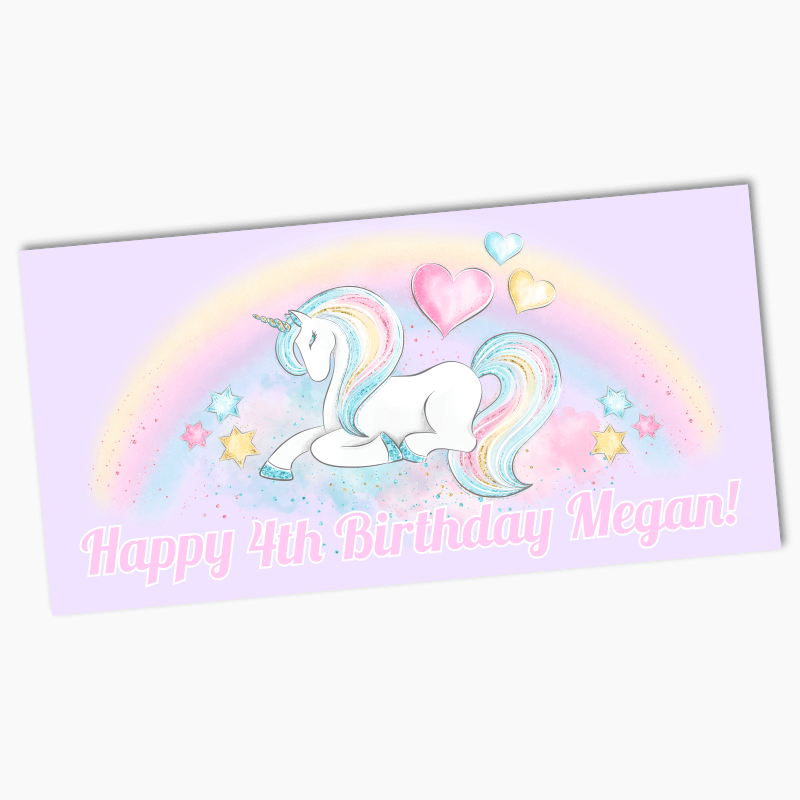 Check Out our Full Range of Personalized Pastel Rainbow Unicorn Birthday Party Banners, Decorations & Labels. We also have Discounted Party Packs Available at Amazing Prices!