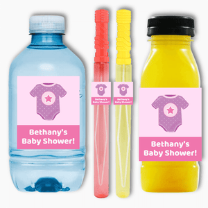 Looking for a fun and versatile way to add a personal touch to your party decorations? Look no further than our Personalised Pink & Purple Onesie Baby Shower Rectangle Stickers! These customised stickers are perfect for decorating drinks, favours, loot boxes, and even bubble wands!