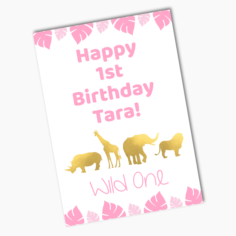 Make your little girl's first birthday truly unforgettable with our Personalised Pink & Gold Safari Animals Wild One Party Decorations. Order now and create a magical and personalised celebration that will be cherished for years to come.