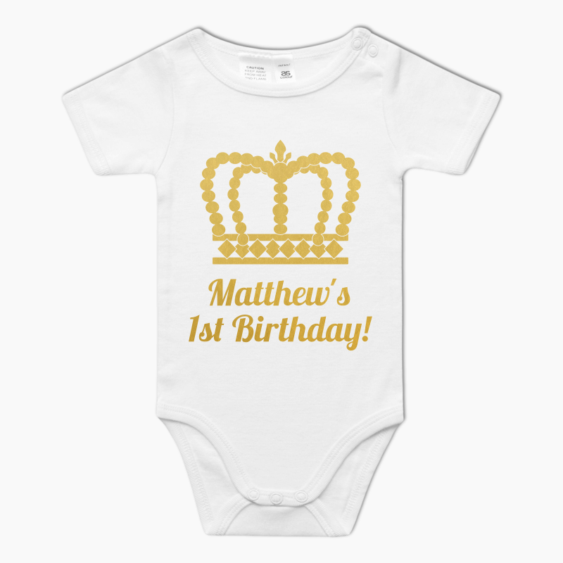 Celebrate your baby's special day with an outfit as unique as the occasion itself. Order your Personalised Prince Crowns Baby One-Piece Romper today and make your little one the star of the party.