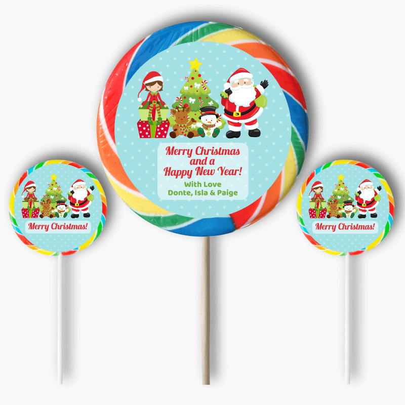 The Design Features a Fun and Adorable Scene with a Santa, Elf, and Snowman against a bright blue Christmas Sky. The message, “Merry Christmas and a Happy New Year” will greet all your loved ones and guests!