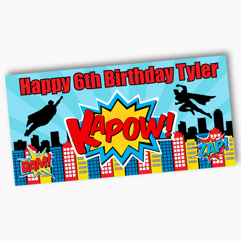 Get ready to save the day with our Personalised Superheroes Birthday Party Decorations! Featuring an exciting aqua stripe background, classic red, yellow, and blue cityscape with bold black silhouette superheroes battling across the skyline, these decorations are perfect for boys, girls, and unisex or joint birthday parties. Fun clipart created by the talented Color Luxe Studio and Vexyl Grafik. Cartoon action bubbles with phrases like 'Kapow,' 'Bam,' and 'Zap' add a fun, comic-book vibe to your celebration.