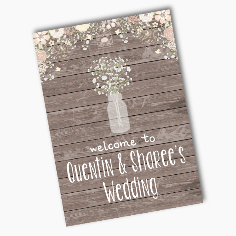 Make your engagement party unforgettable with our Personalised Rustic Timber and Baby's Breath Engagement Party Decorations. This beautiful design features a wooden timber background with hand-painted pastel peach and cream flowers, white baby's breath in mason jars clipart by designloverstudio, and custom message in cursive font and colour of your choice. The happy couple's names and occasion will be personalised on the decorations, adding a unique touch to your engagement party celebrations.