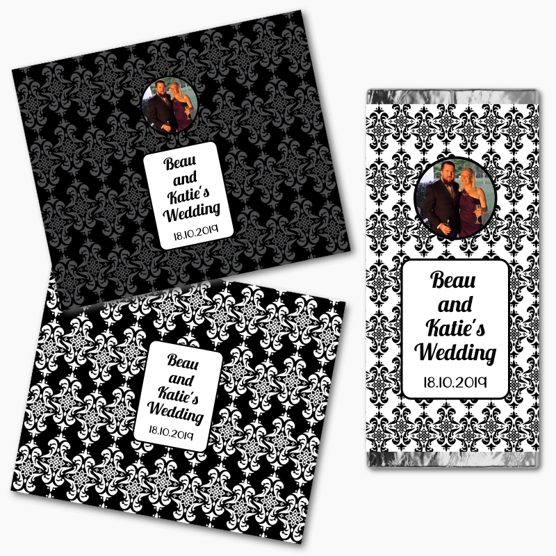 Our Personalised Elegant Damask Mini Chocolate Labels with Photo are the perfect addition to any special event or celebration. These custom chocolate bar wrappers are designed to create a unique and memorable party favour that your guests will love.
