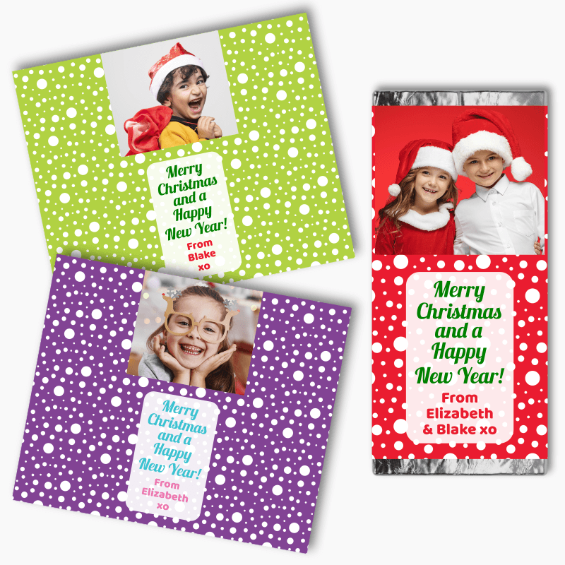 They fit perfectly around bars of Aldi Choceur Mini Chocolates, and come in several high-quality, customisable themes. They’re easy to peel and stick onto your treats. All you need to do is remove the outer, existing wrapper of your chocolates and apply our Personalised Christmas Labels instead!