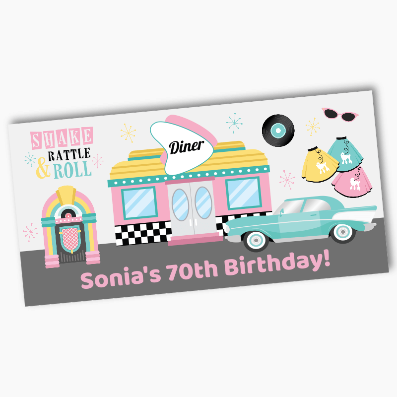 Check Out our Full Range of Personalized 50s Birthday Party Banners, Decorations & Labels. We also have Discounted Party Packs Available at Amazing Prices!