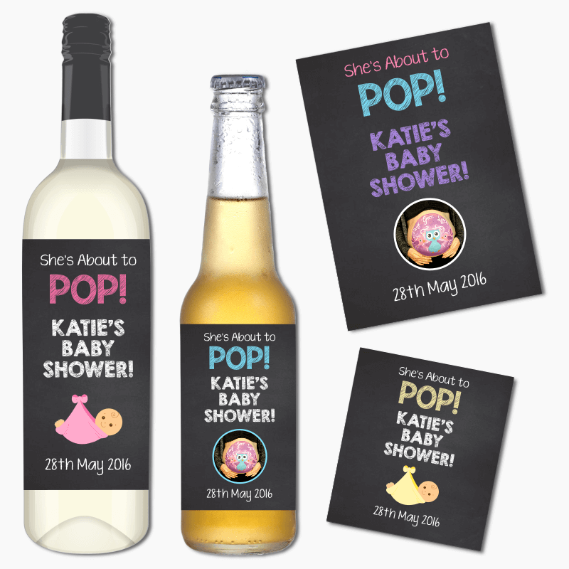 Celebrate the upcoming arrival of a little bundle of joy with a unique touch to your baby shower festivities. Our Personalised 'About to Pop' Wine & Beer Labels are the perfect addition to add a splash of fun and color to the drinks served at this joyous occasion. These labels are not just any ordinary stickers; they come in a set of four delightful and vibrant designs that will surely brighten up any beverage, alcoholic or non-alcoholic, aligning perfectly with the theme of Drinks for a Baby Shower.
