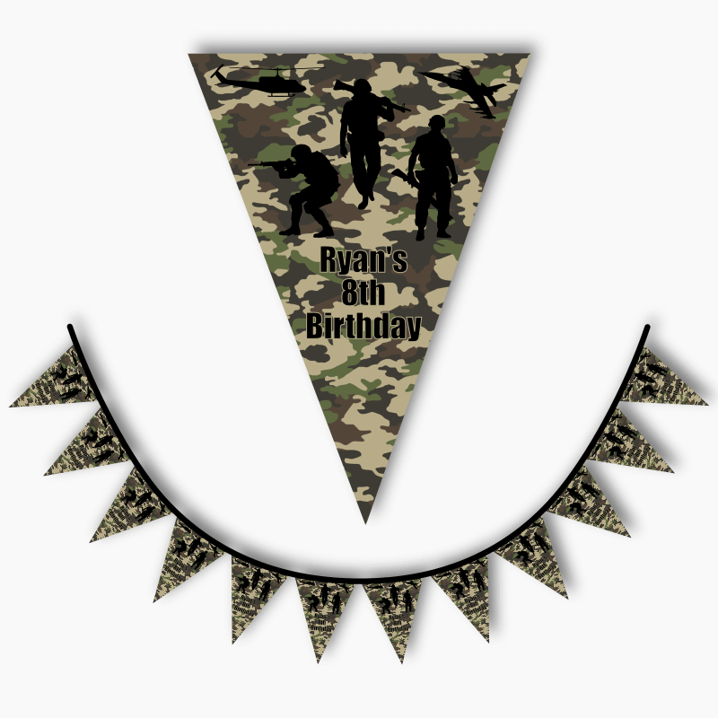 Check Out our Full Range of Personalized Army and Camouflage Birthday Party Banners, Decorations & Labels. We also have Discounted Party Packs Available at Amazing Prices!