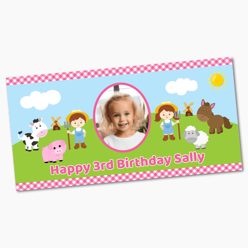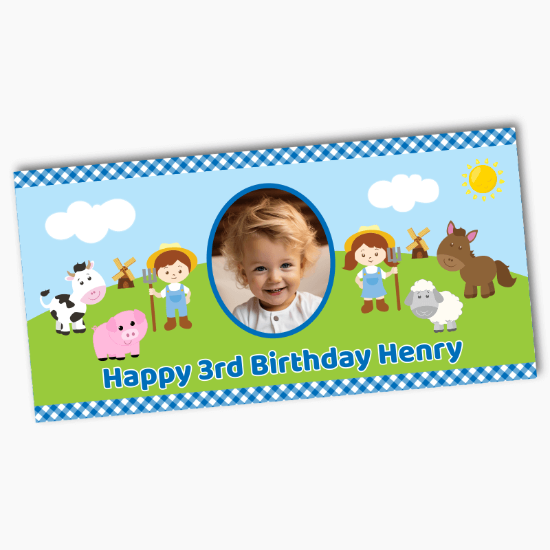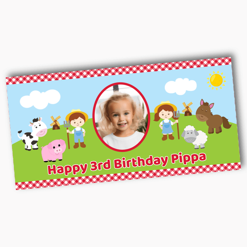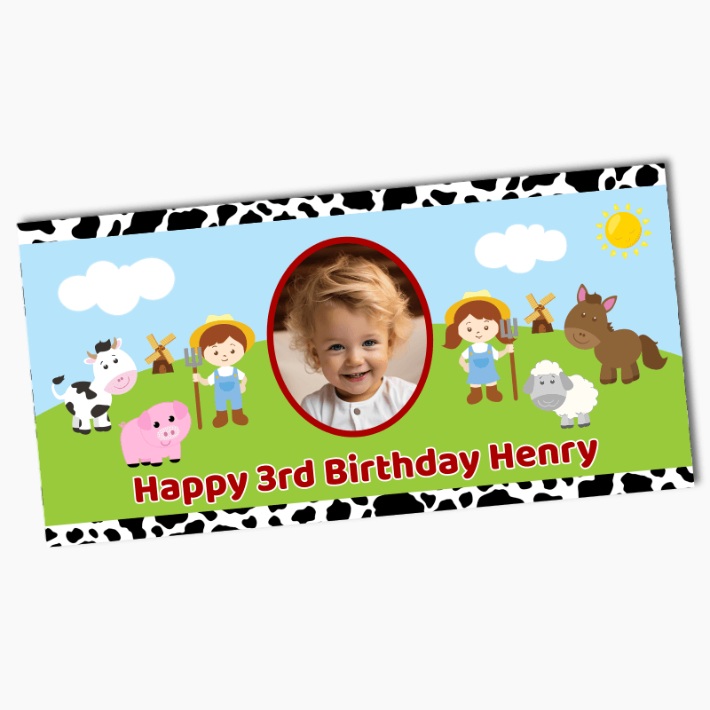 Bring the charm of the countryside to your celebration with our Personalised Barnyard Farm Animals Party Banners with Photo! Perfect for barnyard or farm animal-themed parties, these custom banners let you upload a photo of the birthday guest using our simple online editor and preview your unique design instantly.