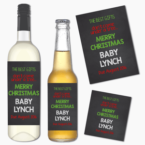 Unveil your joyous news in a memorable and festive manner with our unique 'The Best Gifts Don't Come Under a Tree' Christmas Pregnancy Announcement Wine and Beer labels. These labels provide a distinctive and personal way to announce your upcoming little bundle of joy, custom printed with your baby's surname or nickname and their expected arrival date.