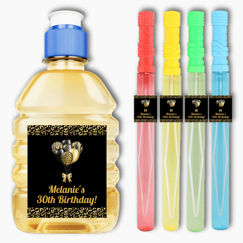 Looking for a fun and versatile way to add a personal touch to your party decorations? Look no further than our Personalised Black & Gold Balloons Birthday Party Rectangle Stickers! These customised stickers are perfect for decorating drinks, favours, loot boxes, and even bubble wands!