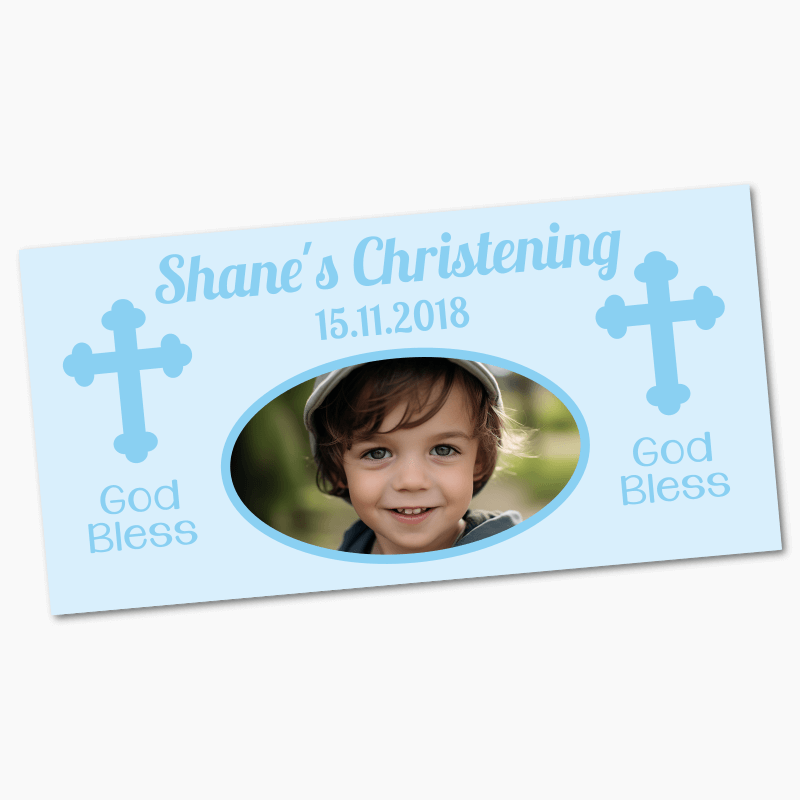 Check Out our Full Range of Personalized Blue Religious Cross Christening Banners, Decorations & Labels. We also have Discounted Party Packs Available at Amazing Prices!