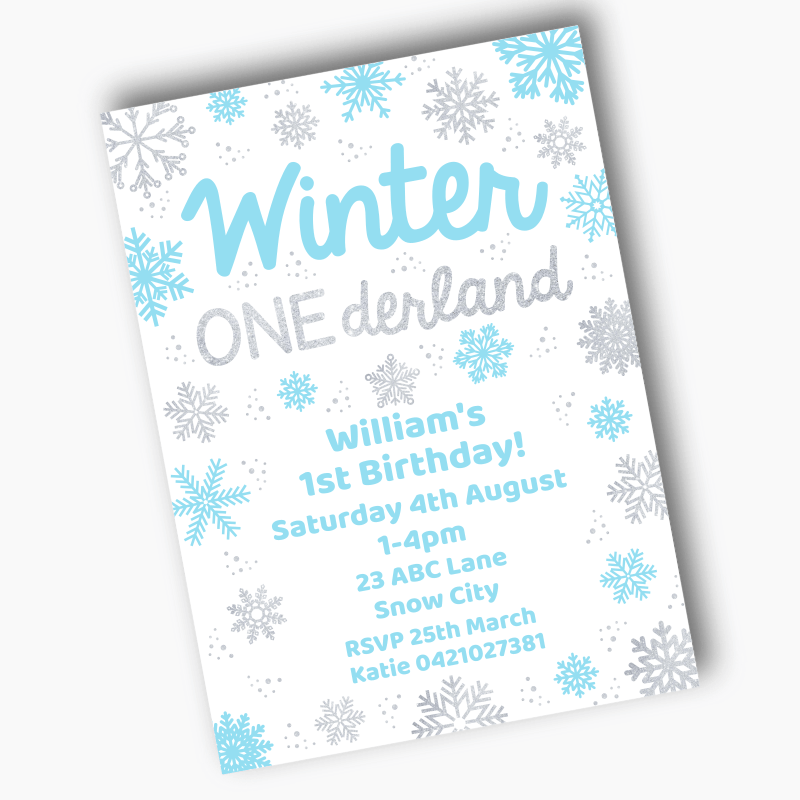 Are you looking for a way to make your party stand out from the rest? Look no further than our Personalised Blue Winter ONEderland Party Invites! Our amazing invitations are designed to impress your guests from the moment they receive them.