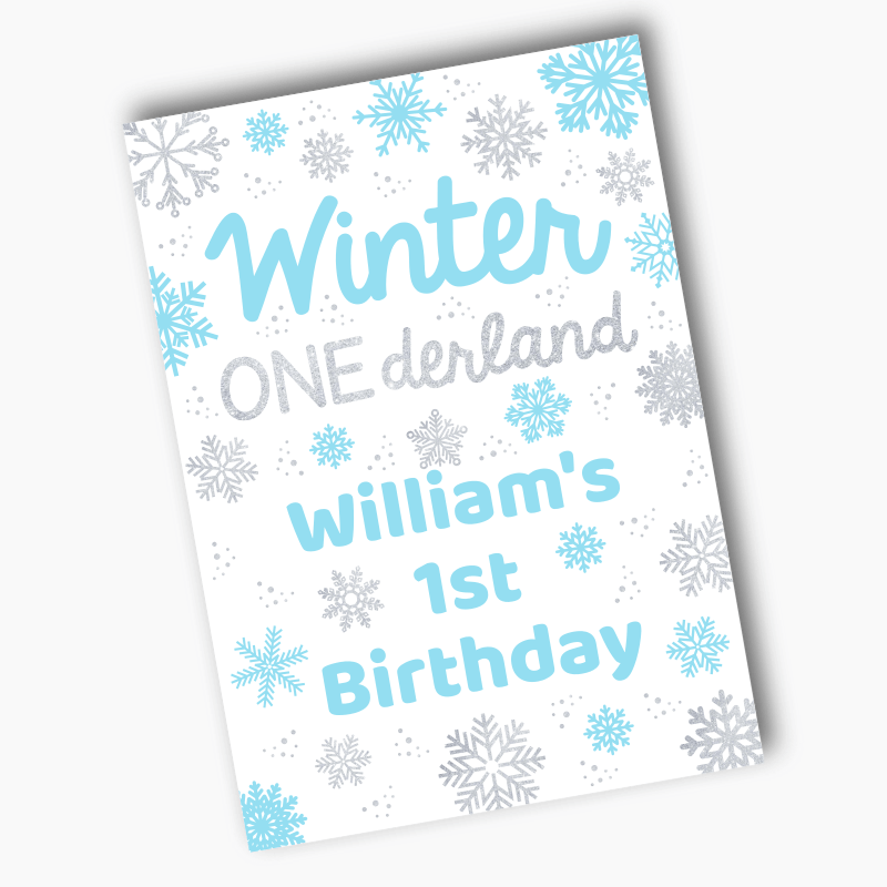 Each party sign is printed with your own custom message, including your name and occasion, making it the perfect addition to any celebration. Our Personalised Blue Winter ONEderland Party Posters will add a touch of fun and personality to your event.